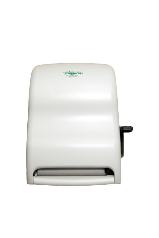 Manual lever-operated towel dispenser suitable for high-volume areas. Offers portion control and minimizes contact for better hygiene.